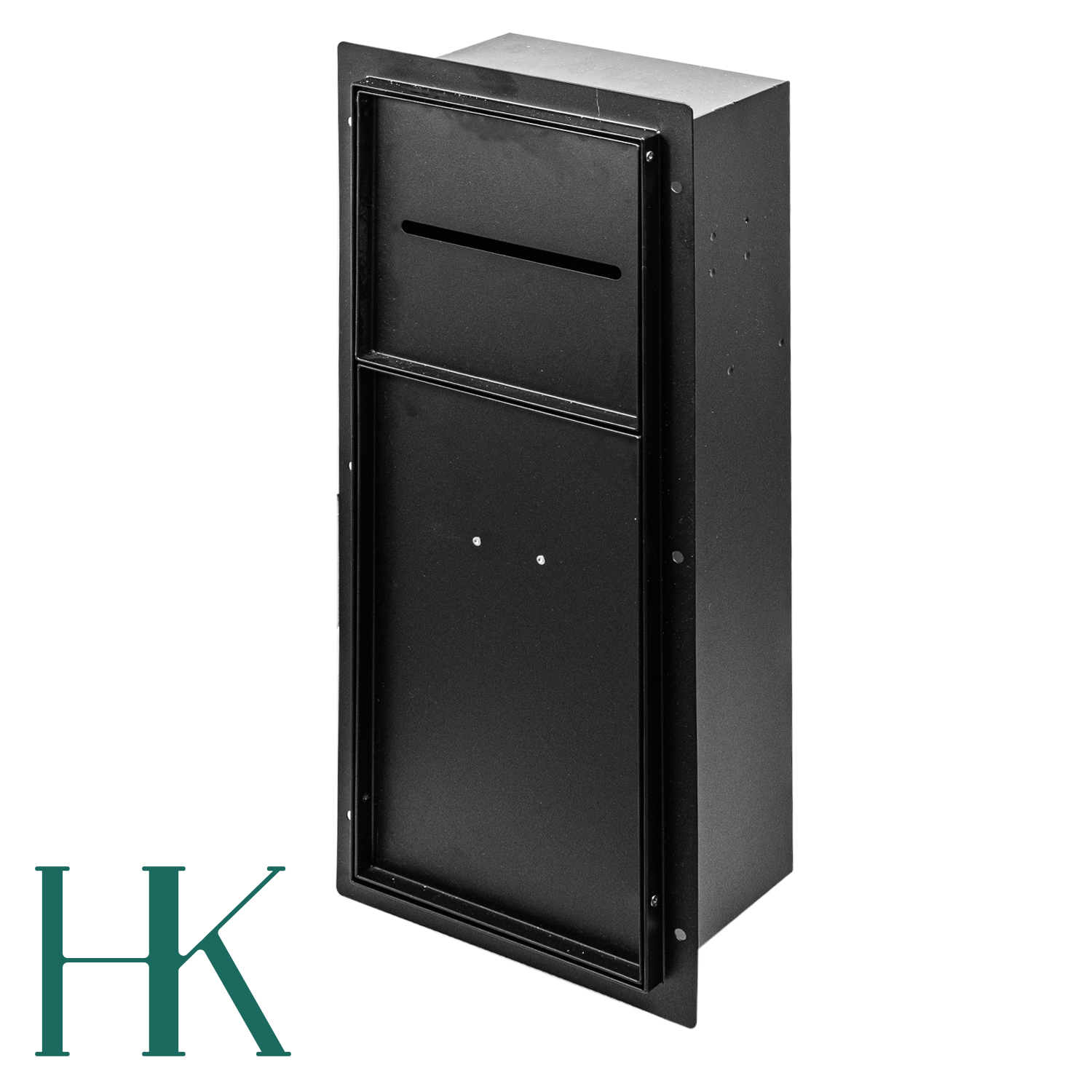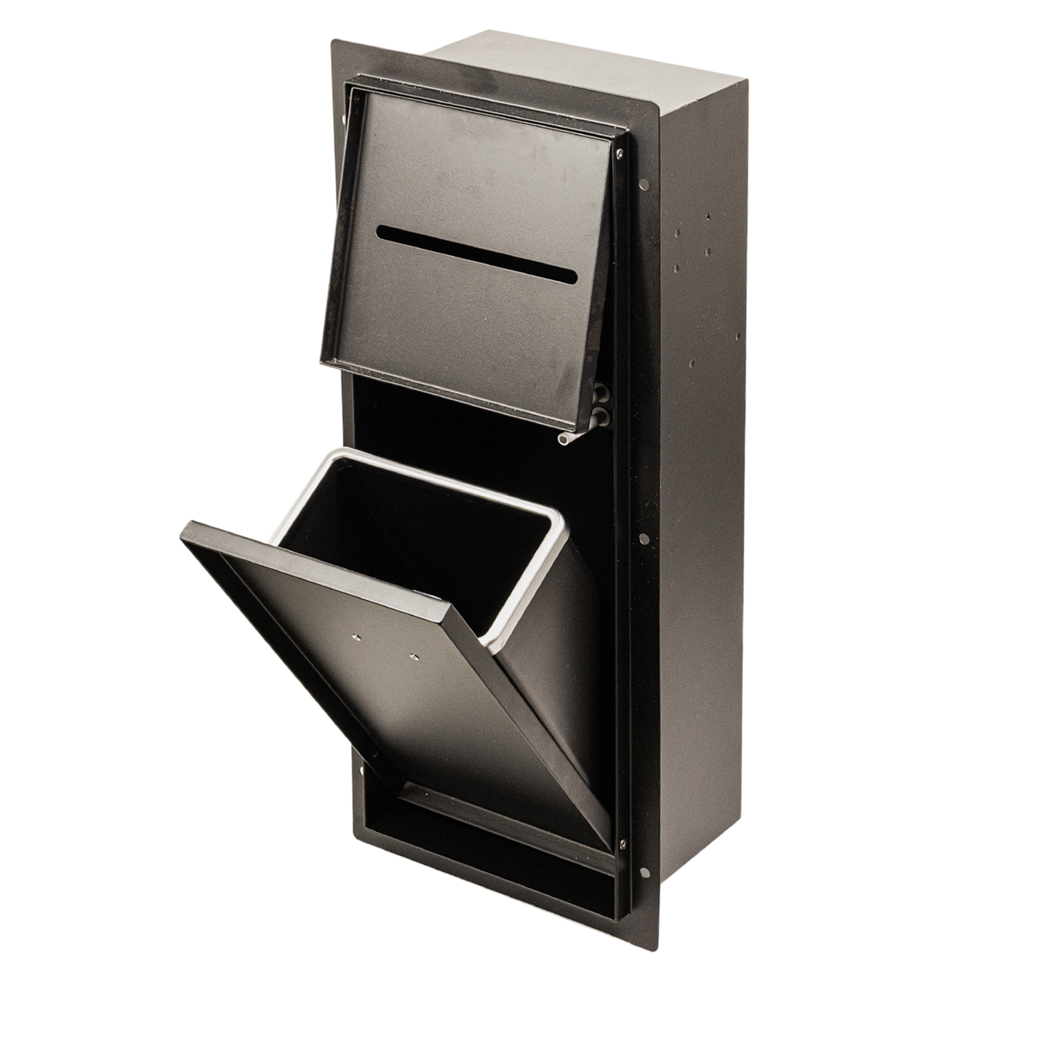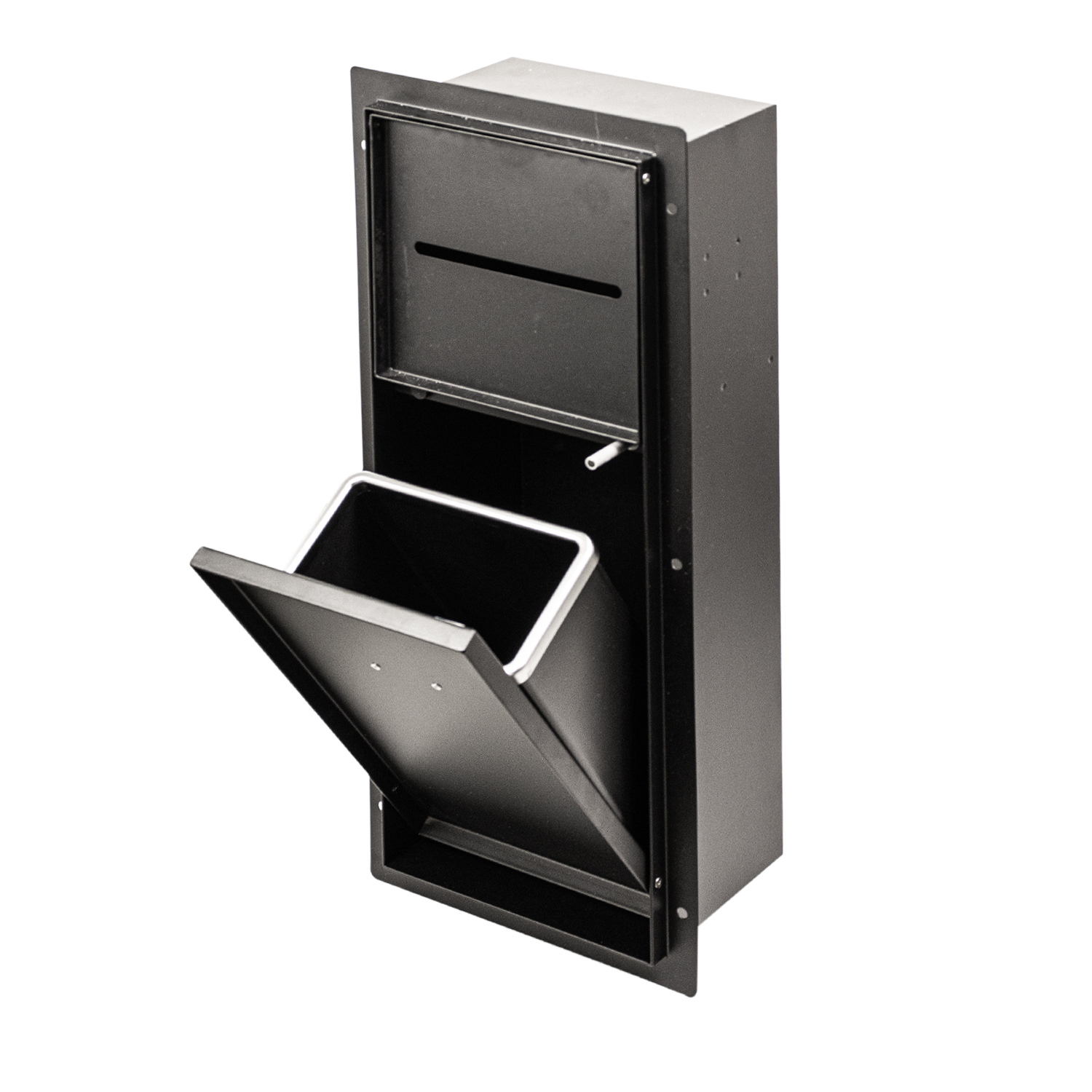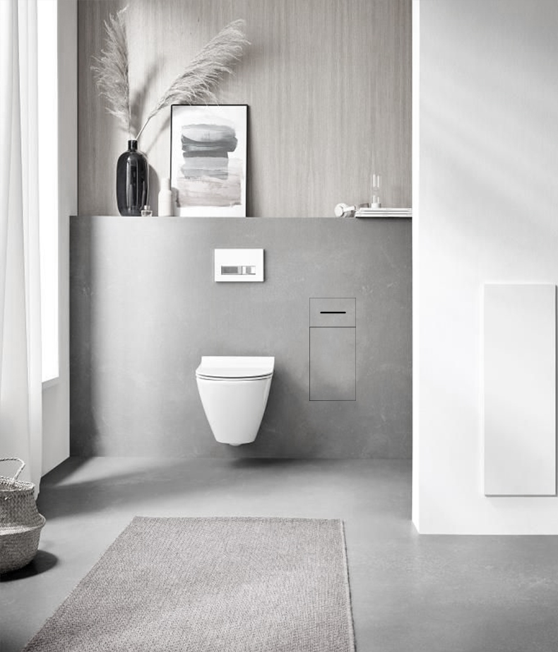 Nowoczesna szafka łazienkowa pod zabudowę. Umożliwia dyskretne ukrycie kosza na śmieci i uchwytu na papier toaletowy. Montowana we wnęce – po obłożeniu płytką staje się niewidoczna.